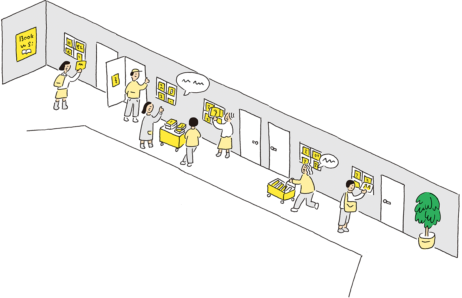 まるで、小さな本屋をめぐるように入居者の本が並ぶ廊下には、仕事帰りにゆっくり本を選ぶ人や本の並びにこだわる人、持ち主とその話題で盛り上がる人や凝りに凝った紹介POPを作る人たちも。