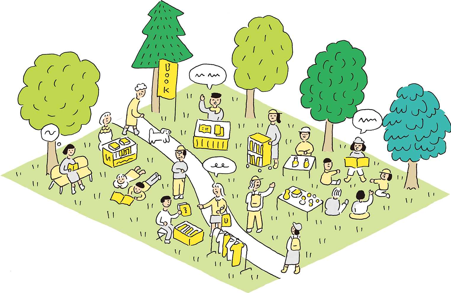 地域のイベントに合わせて、みんなのおすすめを集めた古本市を。当日はふらりと立ち寄ってくれたご近所さんと話をしたり、芝生の上で友人とゴロゴロ読書をしたり、子供たちに読み聞かせをしてみたり。